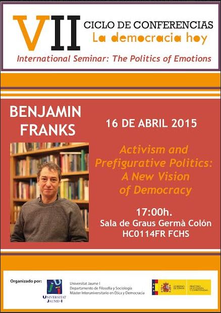 Segundo seminario que compone el VII ciclo de conferencias La democracia hoy – International Seminar: The Politics of Emotions”-, que continúa el día 16 de abril con la participación de Benjamin Franks, investigador en la University of Glasgow y autor de la obra «Rebel Alliances» (AK Press, 2006). El título del seminario es “Activism and Prefigurative Politics: A New Vision of Democracy” y se celebrará a las 17:00 en la Sala de Grados de la Facultad de Ciencias Humanas y Sociales (Universitat Jaume I, Departamento de Filosofía y Sociología).