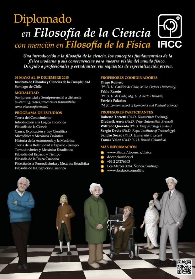 Es muy grato informarles que este 04 de mayo comienza el Diplomado en Filosofía de la Ciencia con mención en Filosofía de la Física organizado por el Instituto de Filosofía y Ciencias de la Complejidad, IFICC, en Santiago de Chile. Este Diplomado cuenta con un cuerpo docente de nivel internacional y especialistas en Filosofía de la Ciencia y de la Física, donde se ofrecerá una visión integral en estas áreas del conocimiento.