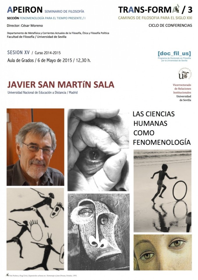 El 6 de Mayo de 2015, a las 12,30 h., en el Aula de Grados de la Facultad de Filosofía de la Universidad de Sevilla impartirá una conferencia el Prof. JAVIER SAN MARTÍN (UNED) sobre LAS CIENCIAS HUMANAS COMO FENOMENOLOGÍA.