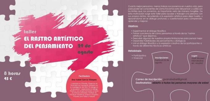 Taller: el rastro artístico del pensamiento Actividades Cursos y talleres Ana Isabel García Vázquez imparte un nuevo taller, que en esta ocasión lleva por título: «El rastro artístico del pensamiento» Toda la información puede consultarse AQUÍ Comparte esto: Haz clic para compartir en Facebook (Se abre en una ventana nueva) Facebook Haz clic para compartir en X (Se abre en una ventana nueva) X Haz clic para imprimir (Se abre en una ventana nueva) Imprimir Haz clic para enviar un enlace por correo electrónico a un amigo (Se abre en una ventana nueva) Correo electrónico Haz clic para compartir en LinkedIn (Se abre en una ventana nueva) LinkedIn Me gusta esto:Me gusta Cargando...