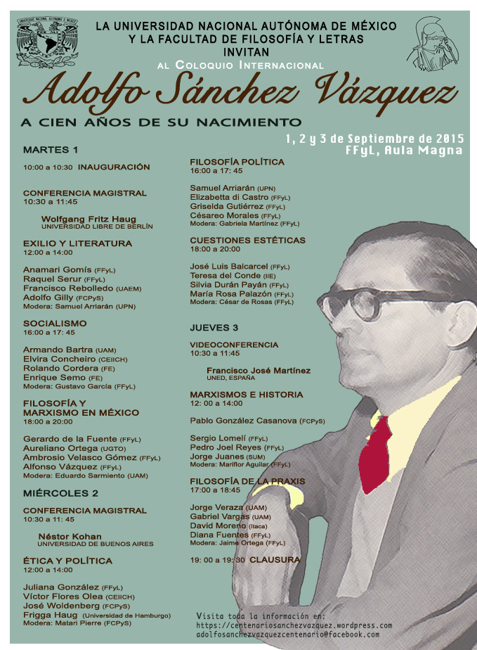 Adjuntamos el programa del Coloquio Internacional «Adolfo Sánchez Vázquez a cien años de su nacimiento» que se celebrará los días 1,2 y 3 de septiembre de 2015 en el Aula Magna de la FFyL-UNAM.