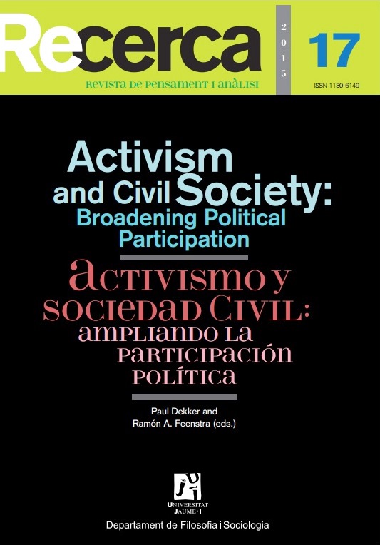 RECERCA es una revista semestral del Dep. de Filosofía y Sociología de la Universitat Jaume I de Castelló. El número 17 de RECERCA se titula Activism and Civil Society: Broadening Political Participation y ha sido editado por Paul Dekker (Tilburg University and The Netherlands Institute for Social Research) y Ramón A. Feenstra (Universitat Jaume I). Os animamos a que consultéis los artículos, de gran carácter internacional, en la página web de la revista: http://www.e-revistes.uji.es/