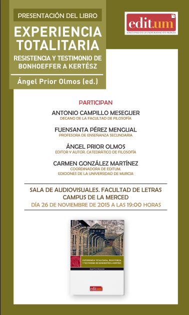 El próximo jueves 26 de noviembre, a las 19:00 h, se presentará en la Facultad de Letras de la Universidad de Murcia el libro titulado Experiencia totalitaria, resistencia y testimonio de Bonhoeffer a Kerstész, coordinado por Ángel Prior Olmos (Murcia, Editum, 2015).