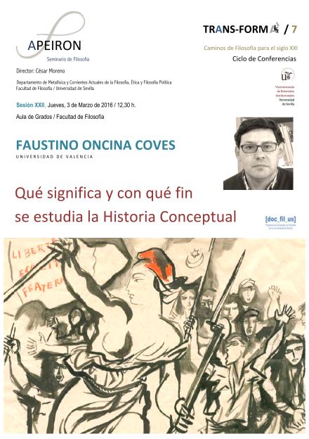 La sesión XXIII de Apeiron-seminario de filosofía, tendrá lugar el jueves 3 de marzo a las 12,30 h. en el aula de grados de la Facultad de Filosofia de la Universidad, y estará a cargo del Prof. Cat. Dr. Faustino Oncina Coves, de la Universidad de Valencia, que impartirá una conferencia sobre «Qué significa y con qué fin se estudia la historia conceptual». La asistencia es libre.