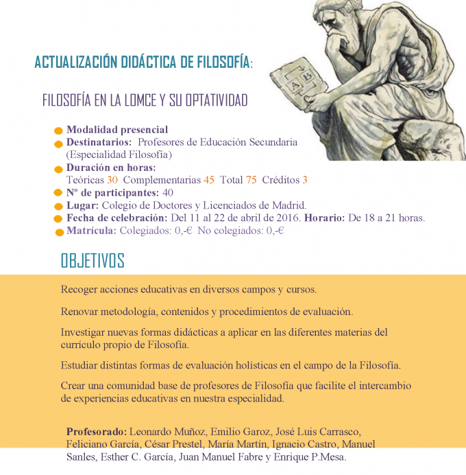 La Asociación de Profesores de Filosofía de Madrid (APFM), con la colaboración del Colegio de Licenciados de Madrid, organiza un curso diferente del 11 al 22 de abril (L-V, de 18 a 21 h).