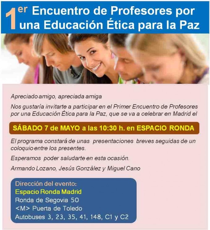 El Primer Encuentro de Profesores por una Educación Ética para la Paz que tendrá lugar en Espacio Ronda Madrid, el 7 de mayo.