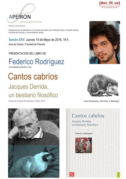 El próximo Jueves 19 de Mayo de 2016, a las 18 h., en el Aula de Grados de la Facultad de Filosofía de la Universidad de Sevilla (c/ Camilo José Cela, s/n) se celebrará la sesión XXV de APEIRON-SEMINARIO DE FILOSOFÍA, que dirige el prof. César Moreno (Universidad de Sevilla). Dicha sesión estará a cargo del Dr. Federico Rodríguez Gómez (Ex-Becario de Investigación de las Universides de Sevilla y Chile y Premio Nacional de Ensayo en Chile en 2014), que presentará su libro Cantos cabríos. Jacques Derrida, un bestiario filosófico, editado por FCE/Chile en 2015. La asistencia es libre.