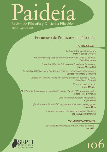 Ya ha salido el número 106 de la Revista Paideía, cuya temática principal gira en torno al Encuentro de Profesores de Filosofía de Enseñanza Secundaria, que tuvo lugar los días 4 y 5 de septiembre del 2015, en el Colegio de Doctores y Licenciados de Madrid.