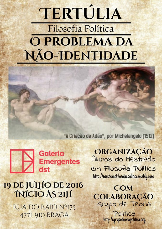 Os alunos do Mestrado de Filosofia Política, em colaboração com o Grupo de Teoria Política, organizam na próxima terça-feira feira dia 19 de Julho às 21h, na Galeria Emergentes, em Braga, uma nova tertúlia, desta vez dedicada ao Problema da Não-Identidade.