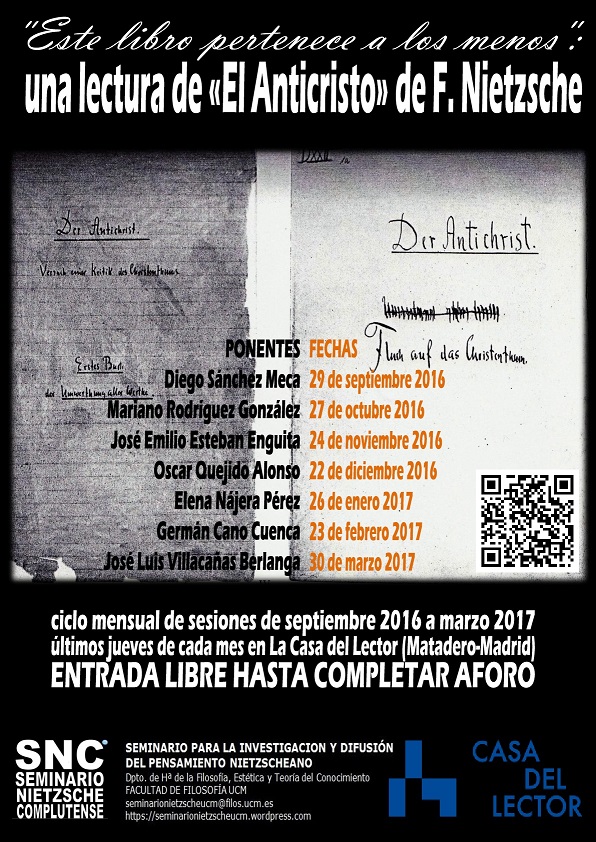 Tenemos el honor de presentar el Seminario para la investigación y difusión del pensamiento nietzscheano. Se trata de un seminario de septiembre a marzo, con sesiones mensuales. La entrada es libre y gratuita, y en el curso 2016-17 le vamos a dedicar a la lectura pormenorizada de una de las principales obras de F. Nietzsche, El Anticristo.