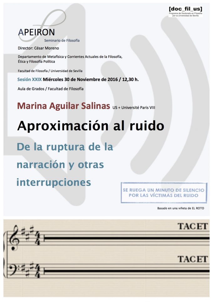 La sesión XXIX de Apeiron-Seminario de Filosofía, que dirige el Prof. César Moreno, tendrá lugar el próximo Miércoles 30 de Noviembre, a las 12,30 horas, en el Aula de Grados de la Facultad de Filosofía de la Universidad. Estará a cargo de Marina Aguilar, que abordará el tema APROXIMACION AL RUIDO. DE LA RUPTURA DE LA NARRACION Y OTRAS INTERRUPCIONES. La asistencia es libre.