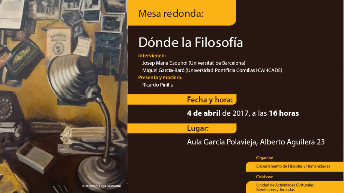 El próximo 4 de abril en Madrid, tendrá lugar la mesa Dónde la filosofía, con Miguel García-Baró y Jose Maria Esquirol. Se trata de una mesa redonda en torno a la filosofía como saber y actividad vital, programada en el horizonte de la defensa de la presencia de la filosofía tanto en la enseñanza como en la cultura.