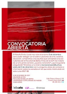 El próximo martes 5 de Diciembre la Cátedra Autric Tamayo (UCM) presenta «Dialogando con Emilio Lledó«. Se trata de un encuentro cercano en el que se podrá dialogar con el profesor Emilio Lledó sobre cuestiones de arte, estética, compromiso o los asuntos que conciernen a los estudiantes de la Facultad de Bellas Artes de la UCM.