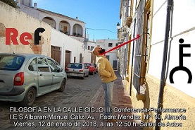 La coordinación del proyecto Filosofía en la calle continúa con las actividades programadas para este año. En esta ocasión anuncia la presentación del Ciclo III: Conferencia-Performance, que se llevará a cabo el próximo 12 de Enero a las 12:50 hora, en el Salón de Actos, I.E.S ALborán-Manuel Cáliz. Av. Padre Méndez, 30, Almería.