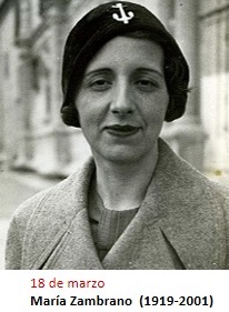 Filósofa, ensayista y poeta, natural de Vélez-Málaga, cursó sus estudios de Filosofía en la Universidad Central de Madrid. Asistió a clases de Ortega y Gasset y fue profesora auxiliar de Metafísica. Activista republicana, salió de España en 1939. El exilio marco su vida. Estuvo en París, en La Habana, en Santiago de Chile, en Roma, fue profesora en la Universidad de Puerto Rico, de nuevo en París, en Suiza, etc. Interesada especialmente por la relación entre filosofía y poesía, desarrolla el concepto de “razón poética” para superar el abismo entre ambas. Tuvo una producción intelectual prolífica. Ya anciana, recibe algunos premios españoles: Príncipe de Asturias (1981) y Cervantes (1988). Entre sus obras cabe mencionar Horizonte del liberalismo (1930), Los intelectuales en el drama de España y una Antología de García Lorca (1936), La agonía de Europa (1945), Senderos (1986), Notas de un método (1987), Hacia un saber sobre el alma (2000), Filosofía y poesía (2001)