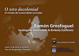 No 35 aniversario da Semana Galega de Filosofía, desde a Aula Castelao, organiza un encontro co profesor Ramón Grosfoguel, membro do grupo modernidade/colonialidade que representa a actualización da tradición de pensamento que tenta incorporar a visión dos colectivos habitualmente excluídos da historia do pensamento. Tratan de botar luz sobre aquelas achegas que minusvaloramos ou ignoramos por proceder dos grupos sociais oprimidos, vencidos ou simplemente alleos aos focos de poder mundial.