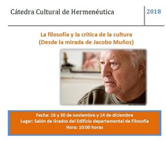 La Cátedra Cultural de Hermenéutica anuncia e invita a participar en las Jornadas La filosofía y la crítica cultural (Desde la mirada de Jacobo Muñoz), que se realizarán en homenaje al profesor Jacobo Muñoz.