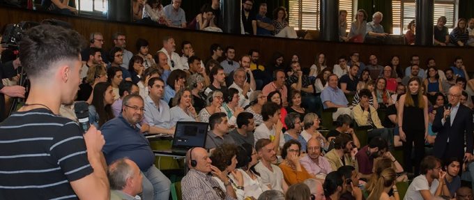 Tras bromear de que tras impartir muchas conferencias en universidades alrededor del mundo, «esta es la primera vez que ha estado en una con dos rectores», y tras pedir que descorriesen las cortinas de la planta superior del paraninfo, para «aportar luz al debate», reconoció que «la vida pública que vivimos, la condición de la democracia en todo el mundo, no está en muy buen estado«. Eso tiene una única ventaja, y es que «la Filosofía siempre ha estado en su mejor momento cuando el mundo se ha enfrentado a problemas, ha estado en confusión, en polarización… Y ahora es precisamente ese tiempo».