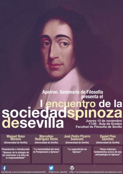El próximo Jueves, 13 de Noviembre, a las 17,00, en el Aula de Grados de la Facultad de Filosofía de la Universidad de Sevilla, y presentado por APEIRON, SEMINARIO DE FILOSOFIA, que dirige el Prof. César Moreno, se celebrará el I Encuentro de la Sociedad Spinoza de Sevilla. En dicho encuentro intervendrán: