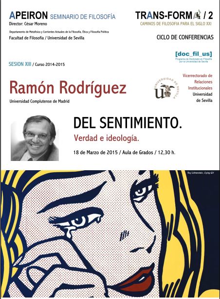 En el marco de las actividades de «APEIRON. SEMINARIO DE FILOSOFIA«, como su sesión XIII, y como segunda de las conferencias programadas del Ciclo «TRANS-FORMA. CAMINOS DE FILOSOFIA PARA EL SIGLO XXI», el miércoles 18 de Marzo intervendrá el Prof. Cat. Dr. Ramón Rodríguez (Universidad Complutense, Madrid), con una conferencia sobre «DEL SENTIMIENTO. VERDAD E IDEOLOGÍA». La sesión se celebrará a las 12,30 en el Aula de Grados de la Facultad de Filosofía de la Universidad de Sevilla, y la entrada es libre.