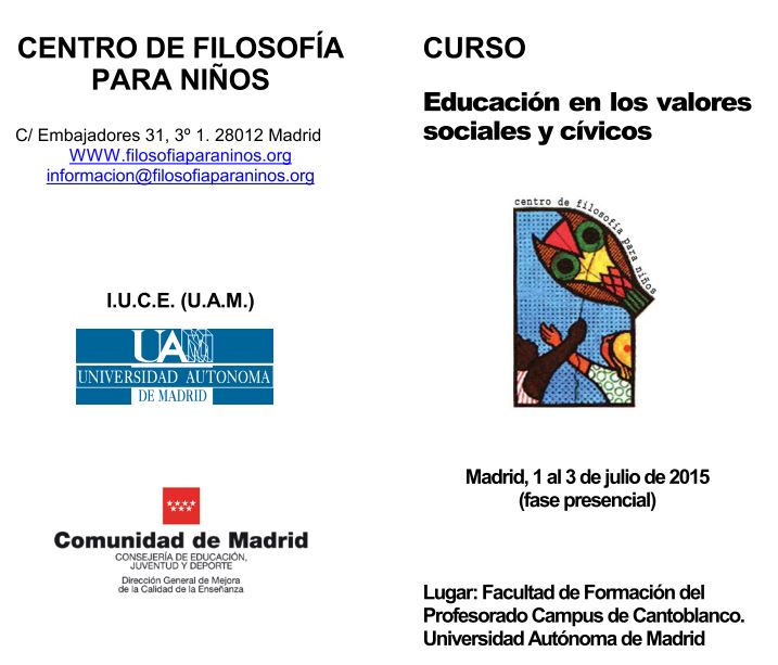 Del 1 al 3 de julio de 2015, Ana Sanz Fuentes junto con otros compañeros del Centro de Filosofía para Niños llevarán a cabo un curso de introducción al diálogo filosófico en comunidad de investigación, a partir de materiales didácticos específicos para la enseñanza de los valores morales en educación primara y secundaria, diseñados por Lipman y Sharp.