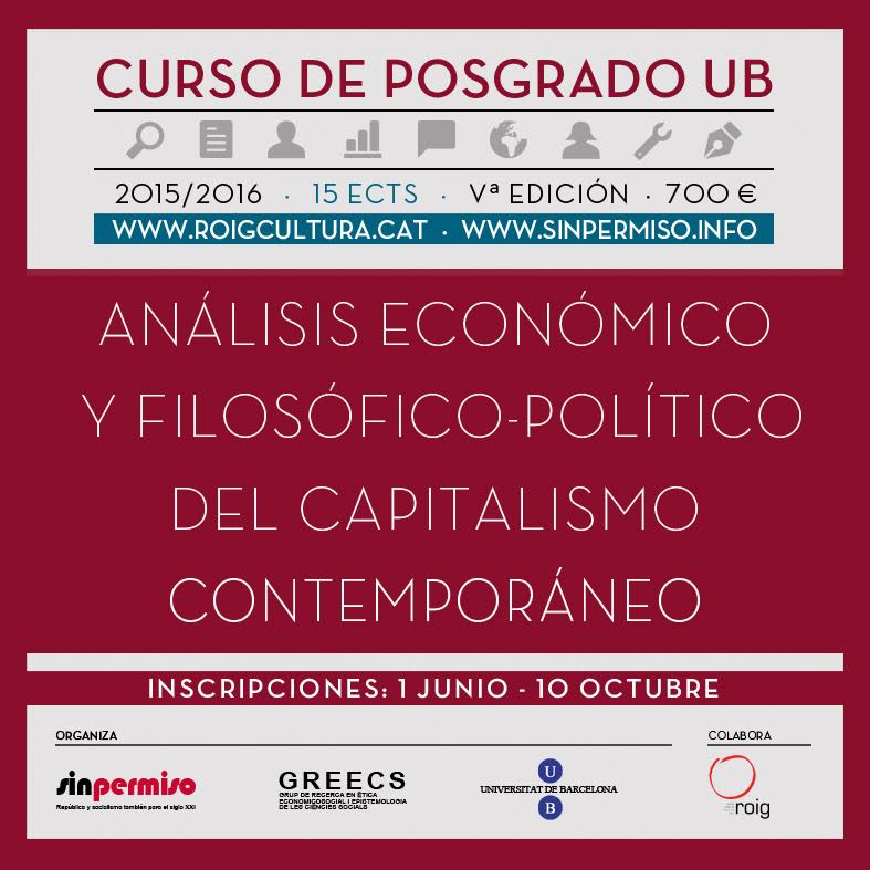 La Universitat de Barcelona mantiene abiertas las inscripciones del Curso Posgrado UB 2015-2016: Análisis económico y filosófico-político del capitalismo cotemporáneo