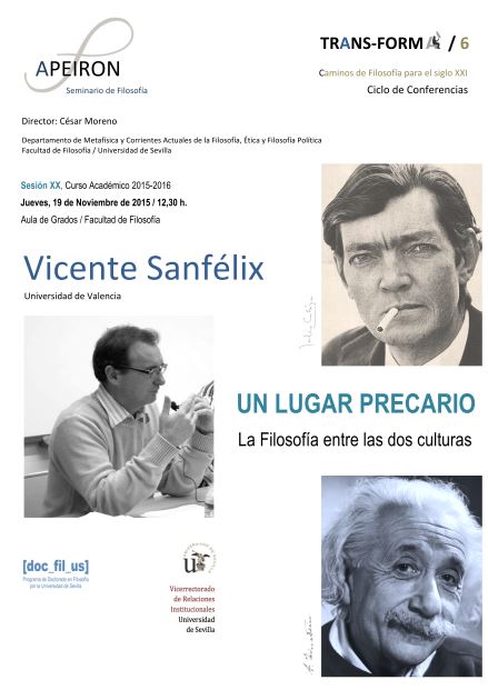 El próximo Jueves 19 de Noviembre tendrá lugar, a las 12,30 h., la sesión XX de APEIRON-SEMINARIO DE FILOSOFIA en el Aula de Grados de la Facultad de Filosofía de la Universidad de Sevilla. Dicha Sesión estará a cargo del profesor Vicente Sanfélix, Catedrático de Filosofía en la Universidad de Valencia. Su conferencia llevará por título: UN LUGAR PRECARIO. LA FILOSOFIA ENTRE LAS DOS CULTURAS. Esta sesión XX equivale a la Conferencia núm. 6 del ciclo TRANS-FORMA. CAMINOS DE FILOSOFIA PARA EL SIGLO XXI, que cuenta con el apoyo del Vicerrectorado de Relaciones Instituciones de la Universidad de Sevilla.