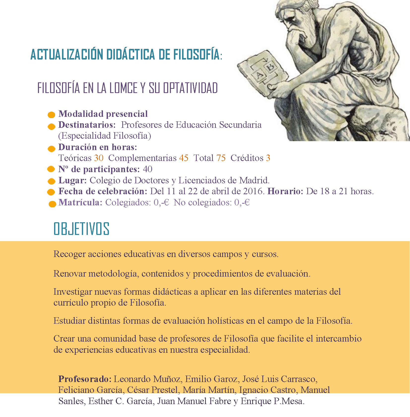 La Asociación de Profesores de Filosofía de Madrid (APFM), con la colaboración del Colegio de Licenciados de Madrid, organiza un curso diferente del 11 al 22 de abril (L-V, de 18 a 21 h).