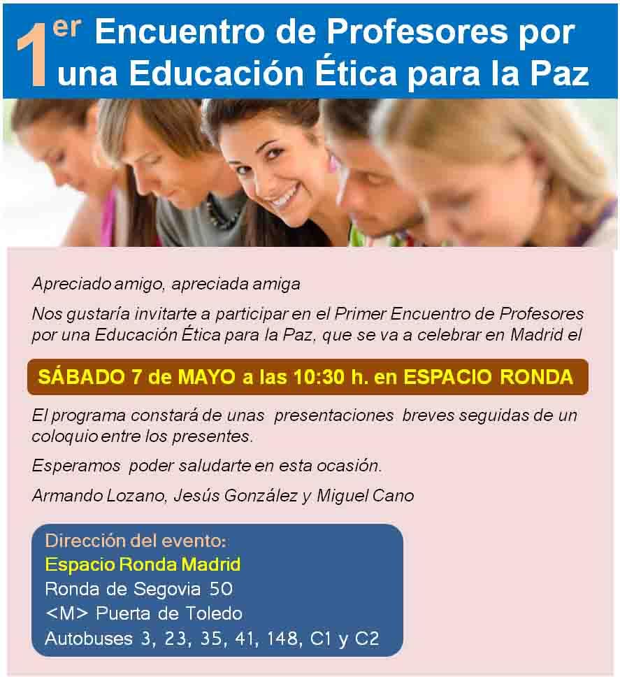 El Primer Encuentro de Profesores por una Educación Ética para la Paz que tendrá lugar en Espacio Ronda Madrid, el 7 de mayo.