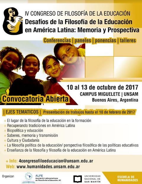 La Asociación Latinoamericana de Filosofía de la Educación, A.C. en conjunto con la Escuela de Humanidades de la Universidad Nacional de San Martín (UNSAM), Buenos Aires, Argentina