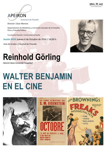 El próximo Jueves 6 de Octubre de 2016, a las 18 h., en el Aula de Grados de la Facultad de Filosofía de la Universidad de Sevilla (c/ Camilo José Cela, s/n) se celebrará la sesión XXVII de APEIRON-SEMINARIO DE FILOSOFÍA, que dirige el prof. César Moreno (Universidad de Sevilla). Dicha sesión estará a cargo del Dr. Reinhold Görling (profesor de Ciencia de los Media en Orientación científico-cultural en la Heinrich-Heine-Universität de Düsseldorf), que impartirá una conferencia sobre «Walter Benjamin en el cine«. La asistencia es libre.