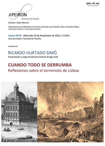 El próximo miércoles 23 de Noviembre tendrá la lugar la Sesión XXVIII de APEIRON-SEMINARIO DE FILOSOFIA en el Aula de Grados de la Facultad de Filosofía de la Universidad de Sevilla, a las 17,00 h. En esta ocasión Ricardo Hurtado Simó presentará su libro «El ocaso del optimismo. De Leibniz a Hamacher. Debates tras el terremoto de Lisboa de 1755», editado por Biblioteca Nueva en 2016. En este acto participará la Profra. Dra. Gemma Vicente Arregui (US). Se impartirá asimismo una Conferencia bajo el título de «Cuando todo se derrumba. Reflexiones sobre el terremoto de Lisboa«. La asistencia es libre.