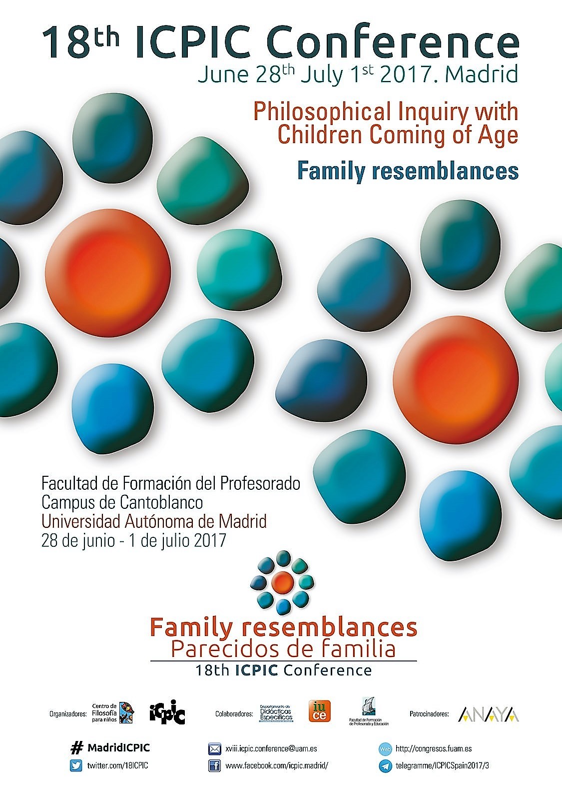Adjuntamos también el enlace del XVIII Conferencia Internacional ICPIC 2017, que tendrá lugar en Madrid entre el 28 de junio y el 1 de julio, y que es un evento de gran relevancia en el que toda la comunidad internacional de Filosofía para Niños se encuentra para proponer experiencias, prácticas y reflexiones en torno al Programa. Puedes encontrar más información en la web: https://goo.gl/5yozFk
