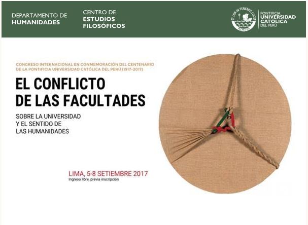 El Departamento de Humanidades y el Centro de Estudios Filosóficos de la Pontificia Universidad Católica del Perú (PUCP) convocan a la comunidad académica a presentar ponencias en el congreso internacional que celebran en conmemoración de su centenario y que estará dedicado al tema: “El conflicto de las facultades. Sobre la Universidad y el sentido de las Humanidades”. El congreso tendrá lugar en Lima, en el campus de la PUCP, del 5 al 8 de septiembre del 2017. Colaboran en su organización la Facultad de Letras y Ciencias Humanas, la Escuela de Posgrado, la Facultad de Estudios Generales Letras, el Instituto Riva-Agüero y el Instituto de Democracia y Derechos Humanos de la misma universidad.