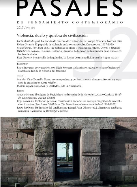 El número 52 de Pasajes: revista de pensamiento contemporáneo dedica su monográfico a la «Violencia, duelo y quiebra de civilización» y ha sido coordinado por Nicolás Sánchez Durá.