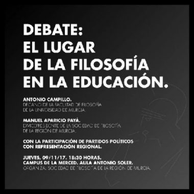 Con motivo del día mundial de la Filosofía, entre los actos que organiza la Sociedad de Filosofía de la Región de Murcia, se encuentra el debate que tiene como tema central «El lugar de la Filsofía en la educación» en el que participarán