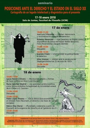 Los departamentos de Filosofía teorética e Historia de la Filosofía, Facultad de Filosofía, UCM, organizan en invitan al seminario «Posiciones ante el derecho y el Estado en el siglo XX. Cartografía de un legado intelectual y diagnóstico para el presente», que se celebrará en la Sala de Juntas de la Facultad de Filosofía.