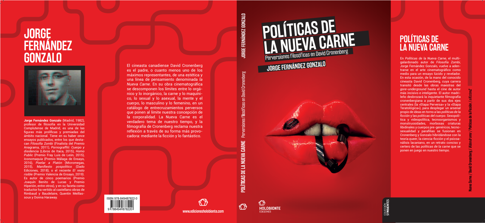 En Políticas de la Nueva Carne, el galardonado autor de Filosofía Zombi, Jorge Fernández Gonzalo, vuelve a adentrarse en el arte cinematográfico como medio para un ensayo lúcido y revelador. En esta ocasión, de la mano del conocido cineasta David Cronenberg, cuya carrera transitó desde las obras maestras del gore-underground hasta el cine de autor más incisivo e inteligente. El autor madrileño desbrozará la inquietante filmografía cronenbergiana a partir de sus dos ejes centrales (la «Etapa Perversa» y la «Etapa Teratológica»), para desplegar un arsenal propio de ideas en torno a las políticas de la ficción y las políticas del cuerpo. Sexopolítica y videopolítica, tecnoorganismos y monstruosidades, morbosas criaturas libidinales y cuerpos pre-genéricos, tecnosexualidad y parafilias se fusionan en Cronenberg y Gonzalo hibridándose con la teoría queer, la ciencia-ficción y el psicoanálisis lacaniano, en un retrato conciso y certero de las políticas de la carne que se ponen en juego en nuestro tiempo.