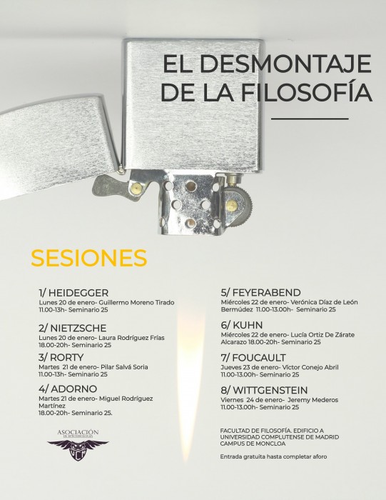 La junta directiva de la Asociación de Epistemología UCM presenta la semana de El desmontaje de la filosofía que tendrá lugar en el seminario 25 de la Facultad de Filosofía de la UCM del 20 al 24 de enero de 2020.