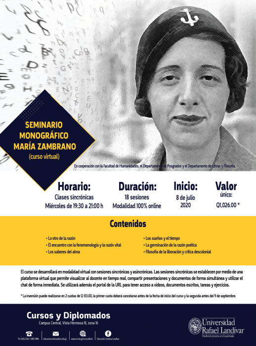La Universidad Rafael Landívar de Guatemala ofrece un Seminario Monográfico sobre el pensamiento de María Zambrano, a partir del miércoles 8 de julio y hasta el 18 de noviembre, dirigido por el profesor David Fernández Navas (Universidad Complutense de Madrid).
