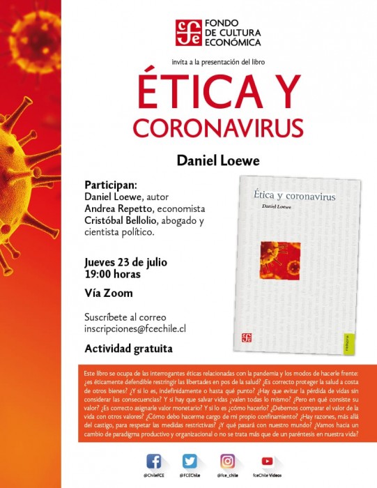 Daniel Loewe presenta el libro titulado «Ética y coronavirus” (FCE, Santiago de Chile, 2020), en el que trata de dar respuesta a algunas de las cuestiones morales más acuciantes que nos hemos ido haciendo durante esta pandemia. La presentación del libro tendrá lugar el día 23 de julio a las 19:00 vía Zoom, con la participación de Daniel Loewe, autor del libro; Andrea Repetto, economista; y Cristóbal Bellolio, abogado.