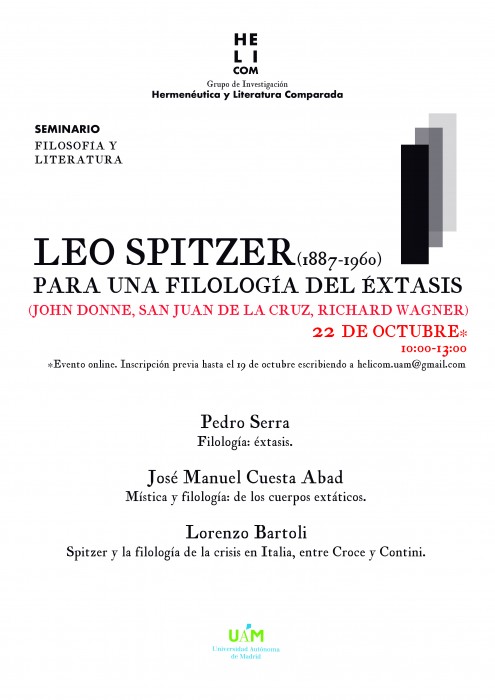 Con motivo del sesenta aniversario de la muerte de Leo Spitzer (1887-1960), el Grupo de Investigación consolidado Hermenéutica y Literatura comparada (Helicom) de la UAM dedica las sextas jornadas de su Seminario de Investigación permanente a la figura de uno de los más grandes filólogos y romanistas europeos del siglo XX. El Seminario, en el que intervendrán como ponentes los profesores Pedro Serra (Universidad de Salamanca), Lorenzo Bartoli (Universidad Autónoma de Madrid) y José Manuel Cuesta Abad, coordinador del Grupo Helicom, girará en torno a dos focos de atención.