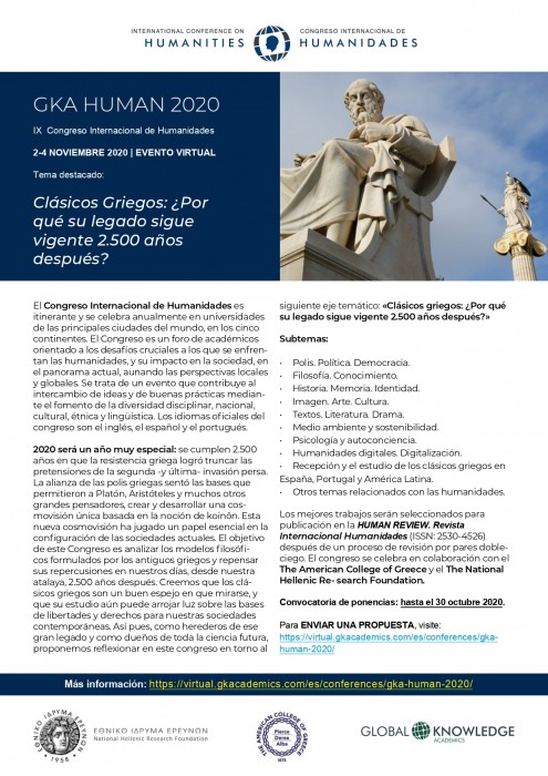 Les informamos de que los próximos días 2, 3 y 4 de noviembre de 2020 tendrá lugar la celebración del Congreso “Clásicos Griegos: ¿Por qué su legado sigue vigente 2.500 años después?” y entre sus líneas temáticas se propone reflexionar sobre la “Recepción y el estudio de los clásicos griegos en España, Portugal y América Latina”. El congreso que inicialmente se iba a realizar en Atenas (Grecia), en la sede del American College of Greece, será celebrado este año 2020 en formato virtual.