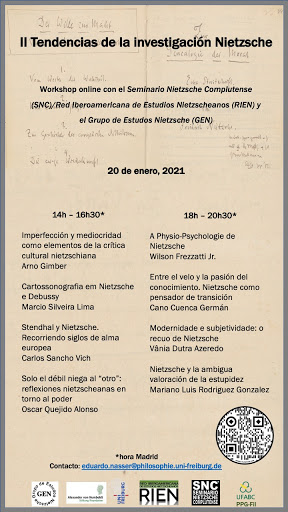 El Workshop «II Tendencias de investigación en Nietzsche» tendrá lugar el Miércoles 20 de enero, 14-20.30 h. Se retrasmitirá online en directo. Inscripciones en este enlace y más información en la página web del Seminario Nietzsche Complutense.