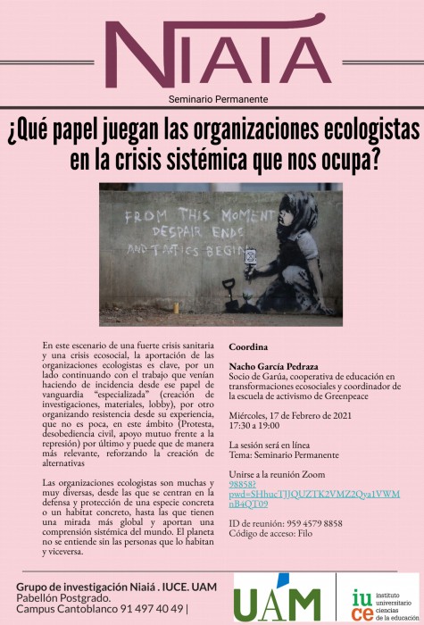 El grupo de investigación Niaiá, coordinado por Félix García Moriyón y Teresa Sanz García, con el apoyo del IUCE, celebra la quinta sesión del Seminario Permanente del curso 2020-2021, que tiene el título general de Hay que hacer algo. El tema de esta sesión es: ¿Hay salida? El papel de las organizaciones ecologistas en la crisis y estará coordinada por Nacho García Pedraza, socio de Garúa, cooperativa de educación en transformaciones ecosociales y coordinador de la escuela de activismo de Greenpeace.