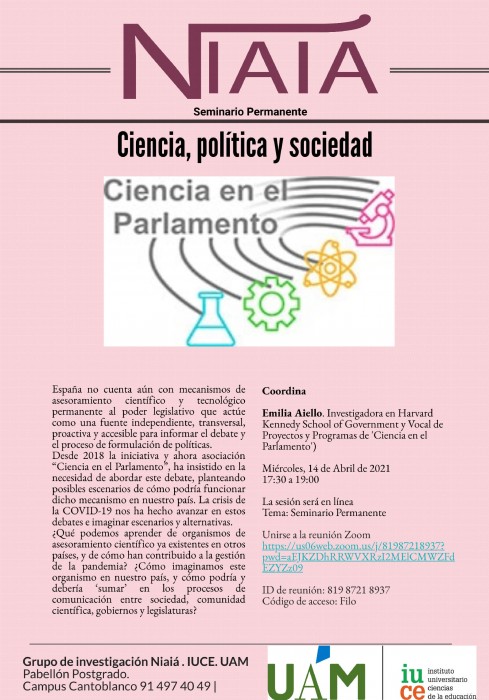El grupo de investigación Niaiá, coordinado por Félix García Moriyón y Teresa Sanz García, con el apoyo del IUCE, celebra la séptima sesión del seminario Permanente del curso 2020-2021, que tiene el título general de Hay que hacer algo. El tema de esta sesión es: Ciencia, política, sociedad. Lleva la sesión Emilia Aiello, investigadora en Harvard Kennedy School of Government y Vocal de Proyectos y Programas de «Ciencia en el Parlamento».