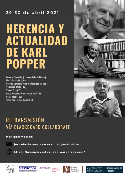 Los próximos días 29 y 30 de abril el Departamento de Filosofía de la Universitat de València acogerá las III Jornadas Herencia y Actualidad https://herenciayactualidad.wordpress.com/, en esta ocasión dedicadas a la figura de Karl Popper (1902 – 1994).  La asistencia y participación en las jornadas, que están especialmente orientadas a alumnos de grado y máster, es libre y gratuita. El programa de la actividad está disponible en la web y el siguiente enlace: https://herenciayactualidad.files.wordpress.com/2021/04/programa-jornadas-popper-2.pdf