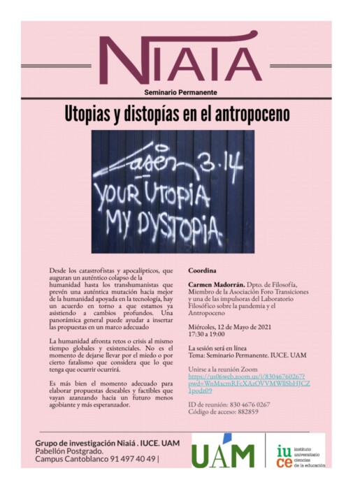 El grupo de investigación Niaiá, con el apoyo del IUCE, celebra la octava y última sesión del seminario Permanente del curso 2020-2021, que tiene el título general de Hay que hacer algo. El tema de esta sesión es: Utopías y distopías en el antropoceno. Lleva la sesión Carmen Madorrán (Dpto. de Filosofía UAM), miembro de la Asociación Foro Transiciones y una de las impulsoras de El Laboratorio Filosófico sobre la pandemia y el Antropoceno.