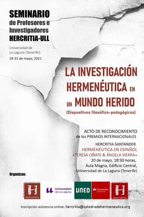 La Cátedra Internacional de Investigación en Hermenéutica y Estética Crítica HERCRITIA celebra entre los próximos días 19 y 21 de mayo, en la Universidad de La Laguna (Tenerife) [Campus Central, Aula Magna, Edificio Central, Calle Padre Herrera, s/n, San Cristóbal de La Laguna, Tenerife, 38200], el Seminario de Profesores e Investigadores HERCRITIA-ULL «La Investigación Hermenéutica en un mundo herido (Dispositivos filosófico-pedagógicos)». El encuentro estará también abierto a la participación telemática de público y la inscripción para asistir virtualmente al mismo puede realizarse solicitando el correspondiente acceso a través del correo: hercritia@catedradehermeneutica.org.