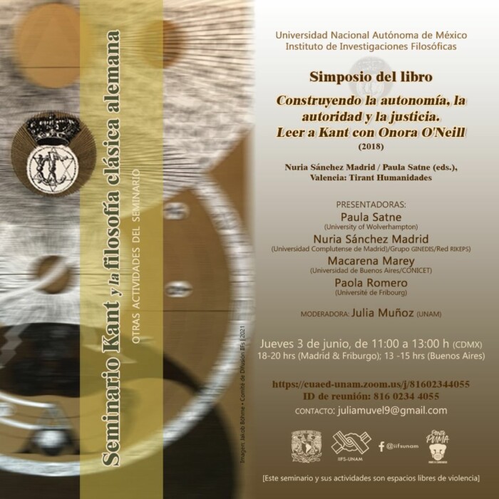 El próximo 3 de junio el Seminario sobre Kant y el Idealismo alemán del IIF-UNAM coordinado por Efraín Lazos, donde se presentará el volumen «Construyendo la autonomía, la autoridad y la justicia. Leer a Kant desde Onora O’Neill» (Tirant lo Blanch) coordinado por Nuria Sánchez Madrid y Paula Satne y en el que participan varios miembros del Proyecto Deduktion (UCM).